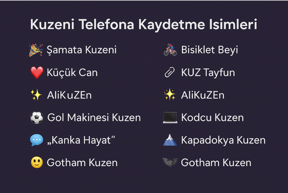 Kuzeni telefona kaydetme isimleri aile bağlarını dijital dünyada daha anlamlı hale getirmenin küçük ama etkili yollarından biridir. Kuzen kimi zaman çocukluk arkadaşımız, kimi zaman sırdaşımız, kimi zaman da mesafeli ama saygı duyduğumuz bir akrabadır. Bu nedenle kuzeni telefona kaydetme isimleri seçilirken ilişki biçimi oldukça önemlidir. Bu içerikte; kuzene samimi hitaplar, komik seçenekler, Kürtçe, Arapça ve İngilizce kuzeni telefona kaydetme isimleri ile birlikte cool, duygusal, tek kelimelik ve mesafeli hitaplar bir arada sunulmaktadır. Her zevke ve ilişki düzeyine uygun özgün önerilerle rehberinizi kişiselleştirebilirsiniz.